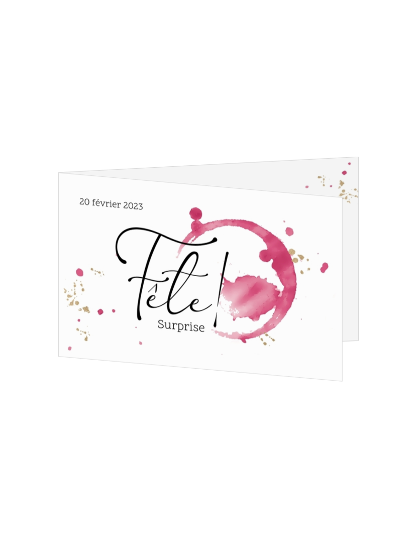 Invitation festive avec tache de vin effet aquarelle et détails dorés.