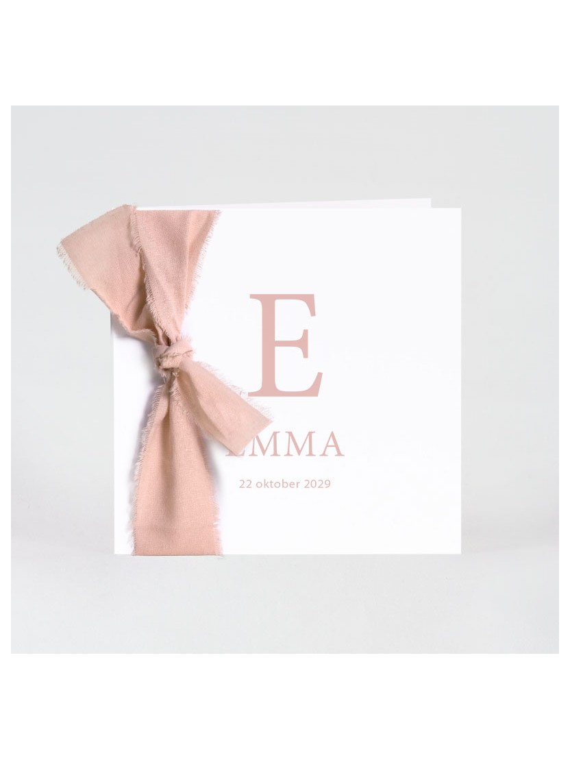 Epuré et élégant, ce faire-part naissance se personnalise de l'initiale de votre enfant et de votre tendre texte à l'intérieur. Un joli ruban en coton rose vient parfaire la finition de cette annonce.