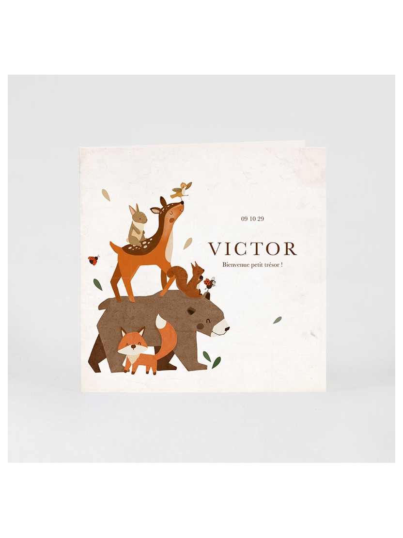 Un faire-part naissance adorable, illustré d’une joyeuse troupe d’animaux de la forêt. Renards, faons, lapins et autres compagnons des bois se réunissent pour célébrer l’arrivée de votre bébé. Un design doux et naturel, parfait pour une annonce pleine de tendresse et de magie. Ajoutez une jolie photo* de bébé pour la rendre unique.