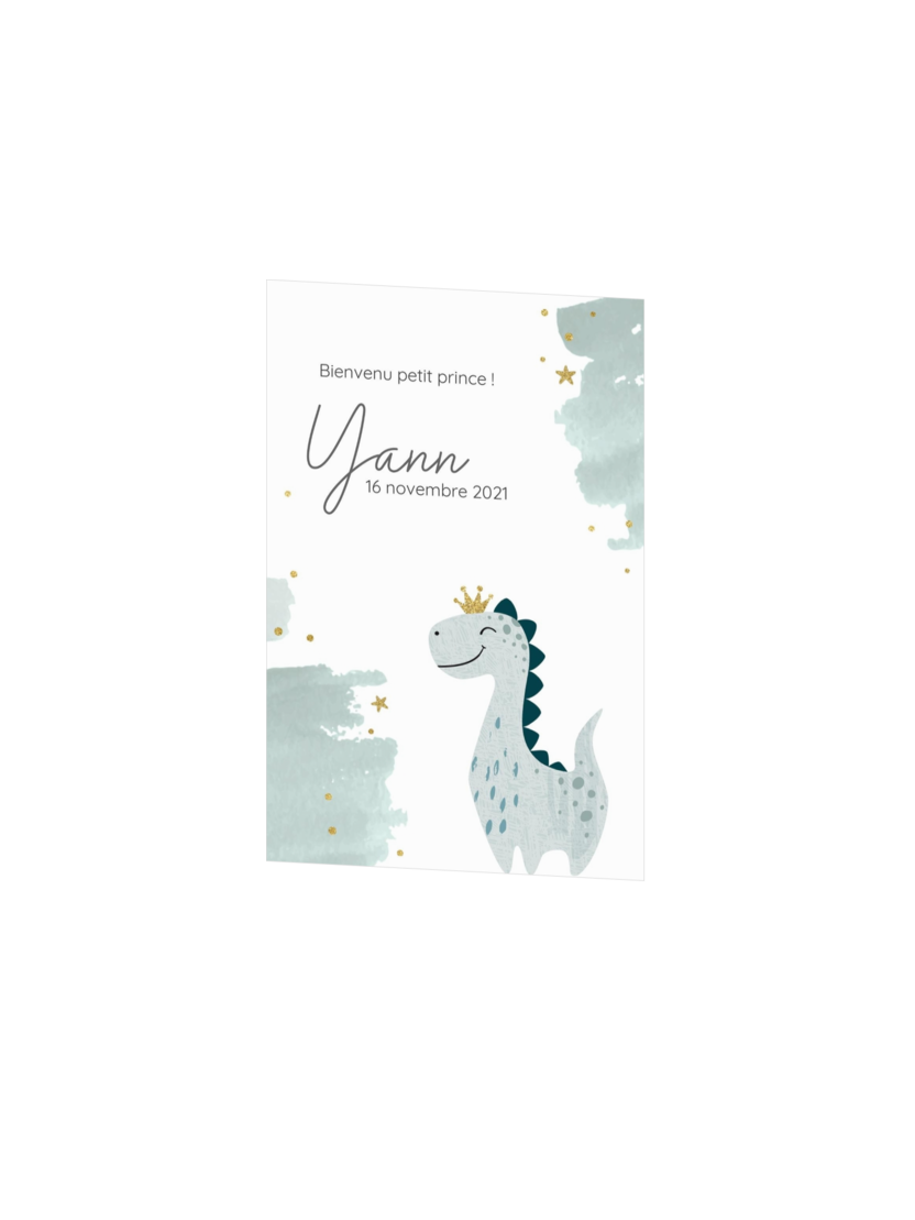 Carte de naissance festive illustrée d’un dinosaure bleu coiffé d’une couronne dorée.