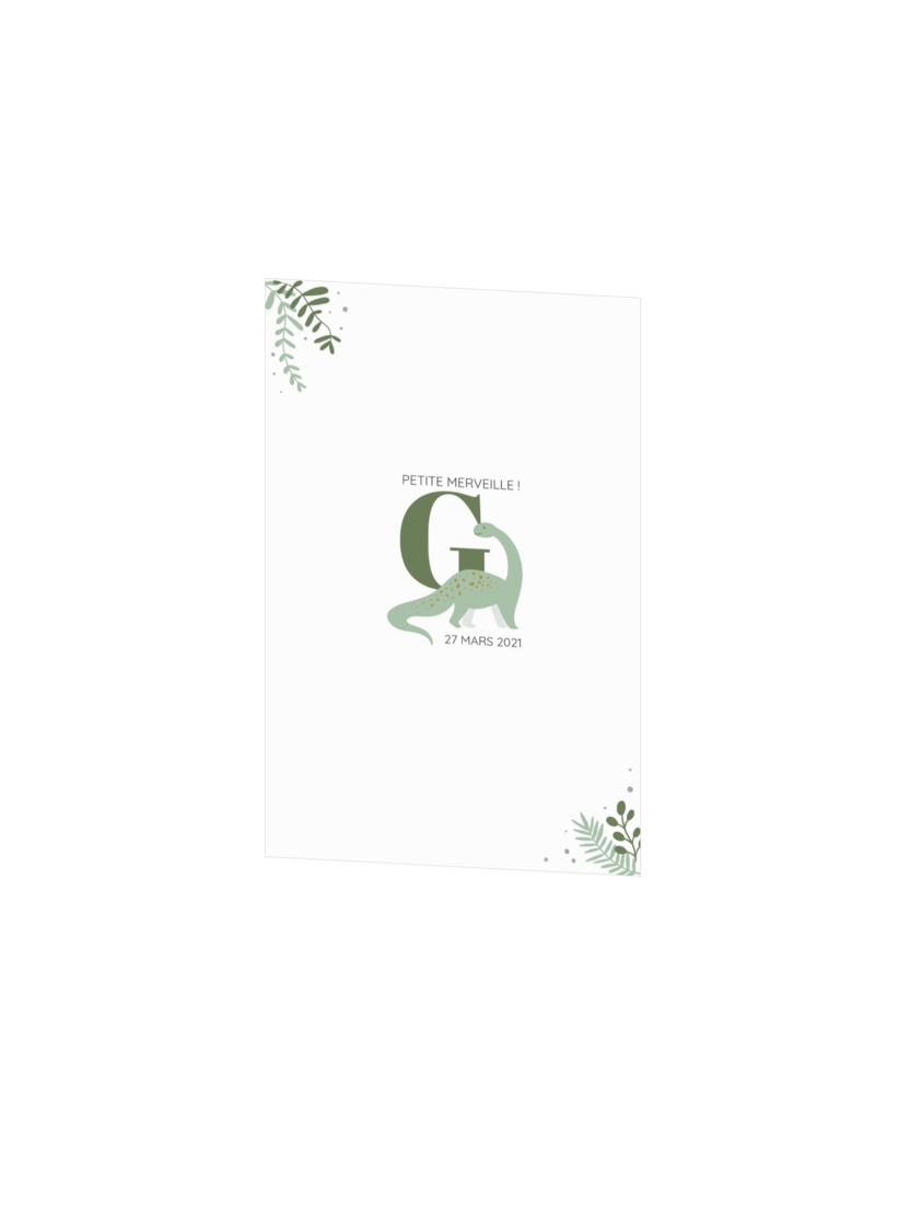 Carte de naissance au format serré avec illustration d’un dinosaure vert. Le dos de la carte peut être personnalisé dans la couleur souhaitée.