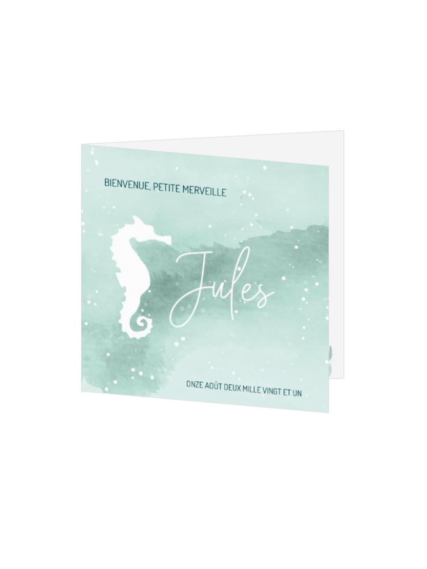 Carte de naissance illustrée d’un hippocampe en aquarelle aux tons menthe. Le verso est entièrement personnalisable selon vos envies.