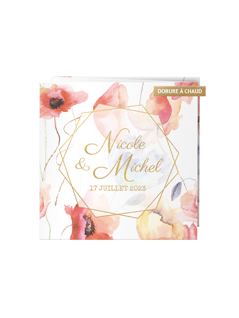 Faire-part de mariage aux couleurs éclatantes, sublimé par de délicates fleurs sauvages aquarellées. Un rendu raffiné, magnifié par vos prénoms et textes en véritable feuille d’or.