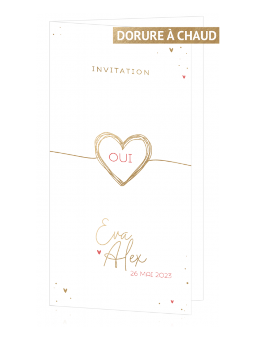 Faire-part de mariage moderne aux finitions précieuses : un cœur dessiné au trait, magnifié par de la véritable feuille d’or et de subtils accents roses.