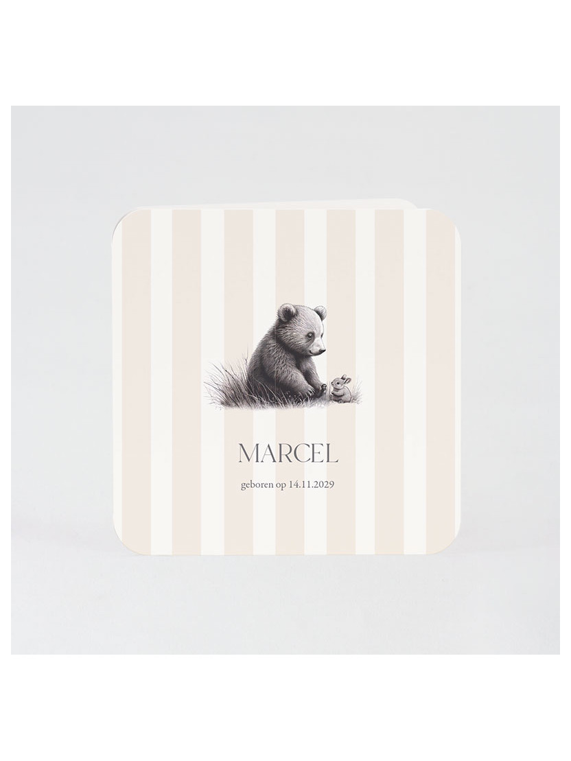 Faire-part de naissance craquant, illustré d'un ourson et d'un petit lapin en noir et blanc. Le fond rayé lui donne un charme rétro irrésistible. Pour une finition parfaite, n'hésitez pas à choisir une enveloppe colorée.