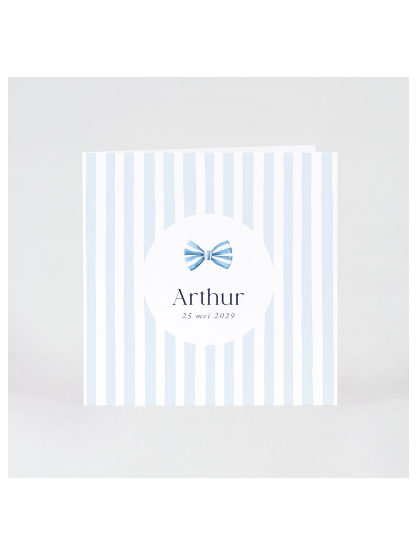 Faire-part naissance petit nœud sur fond ligné bleu et blanc