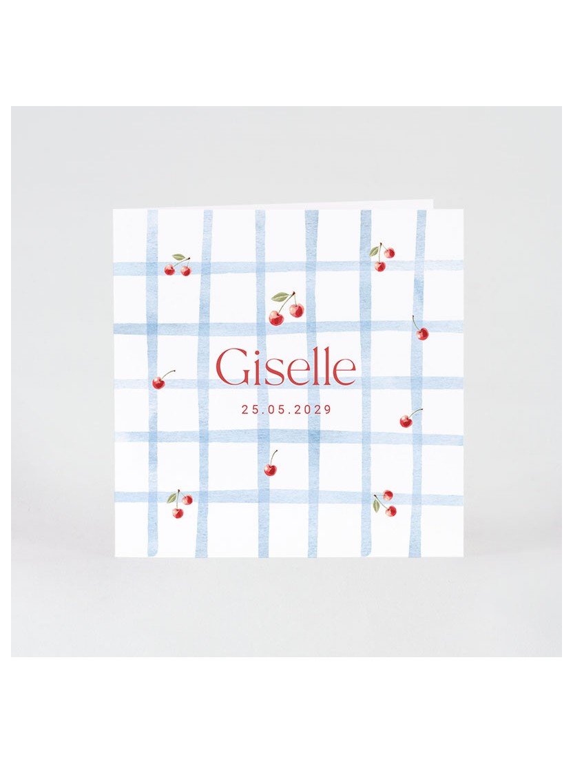 Un faire-part de naissance plein de fraîcheur, orné de petites cerises sur un fond à carreaux délicat. Ce motif évoque l’enfance, la douceur et l’authenticité. Parfait pour annoncer l’arrivée de votre petit trésor avec une touche fruitée et rétro-chic.
