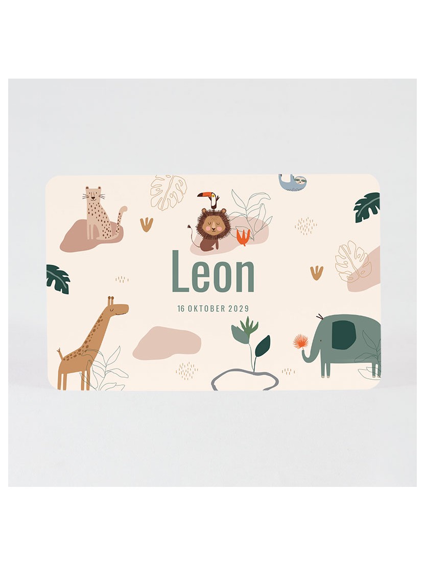 Ce faire-part aux doux motifs enfantins d'animaux de la savane annoncera la naissance de votre bébé avec douceur et tendresse. Vous pouvez ajouter votre texte au dos de la carte.
