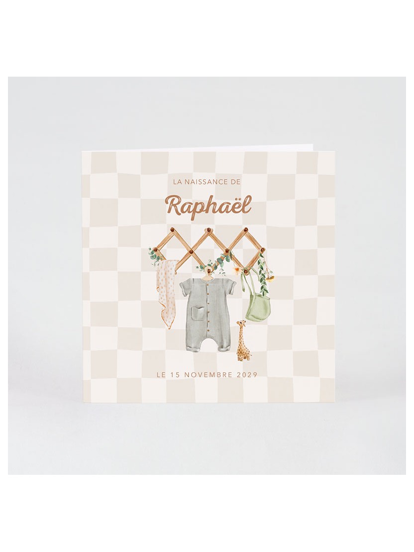 Un faire-part de naissance au style vintage, décoré de petits habits délicats suspendus. Un design plein de tendresse et de nostalgie, parfait pour annoncer l’arrivée de votre bébé avec douceur et authenticité. Vous pouvez ajouter une jolie photo* de bébé à l'intérieur.
