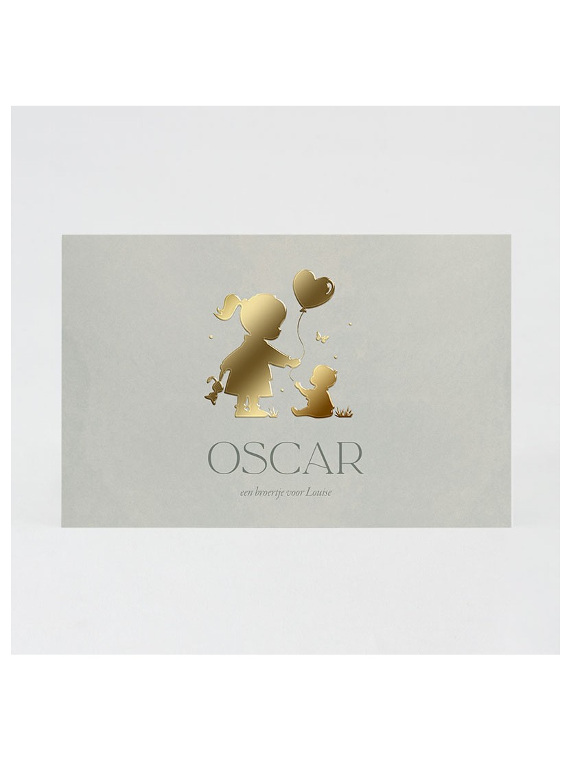 Un faire-part de naissance élégant et intemporel, sublimé par une silhouette de la grande sœur et le bébé en dorure. La finition en dorure apporte une touche précieuse à ce design épuré. Le prénom de votre bébé est imprimé en dorure sans supplément.
